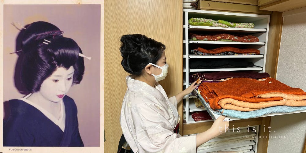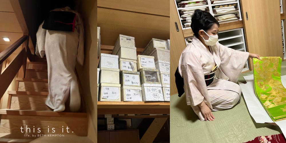 “Come and see this,” Nakaji-san said, leading me to the private quarters of the okiya, and showing me a treasure trove of kimono, silk flower hair accessories, labelled shoeboxes organised by month for seasonality, and all manner of other accoutrements needed to create such the iconic look.